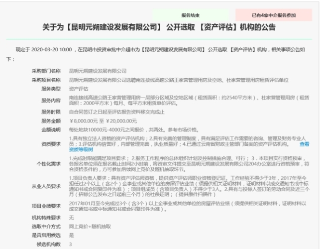 昆明元朔建设发展有限公司选聘南连接线高速公路王家营管理用房及空地、杜家营管理用房租赁评估单位中介超市抽取公告