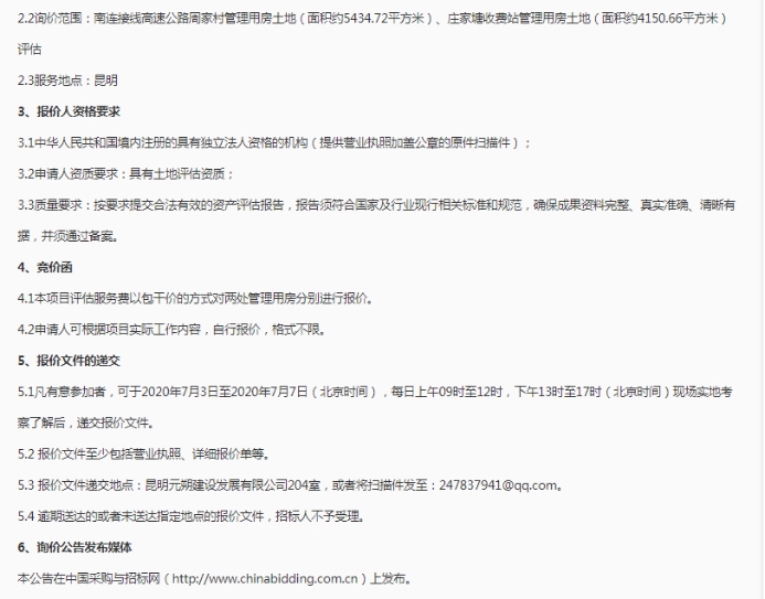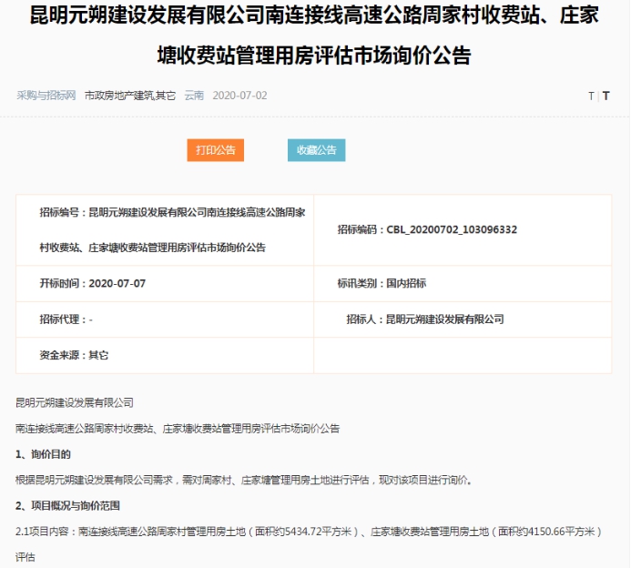 昆明元朔建设发展有限公司南连接线高速公路周家村收费站、庄家塘收费站管理用房评估市场询价公告