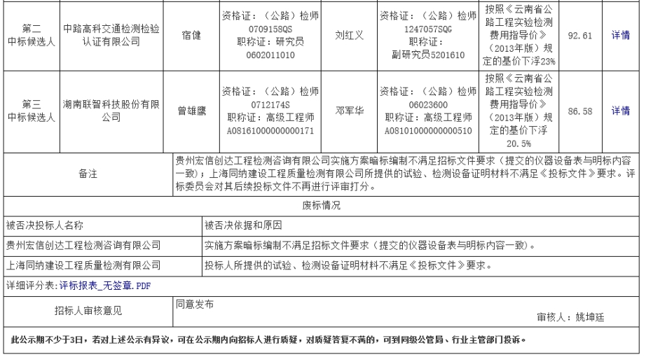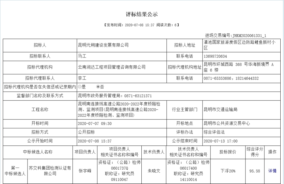 昆明南连接线高速公路2020-2021年度桥隧检测、监测项目评标结果公示