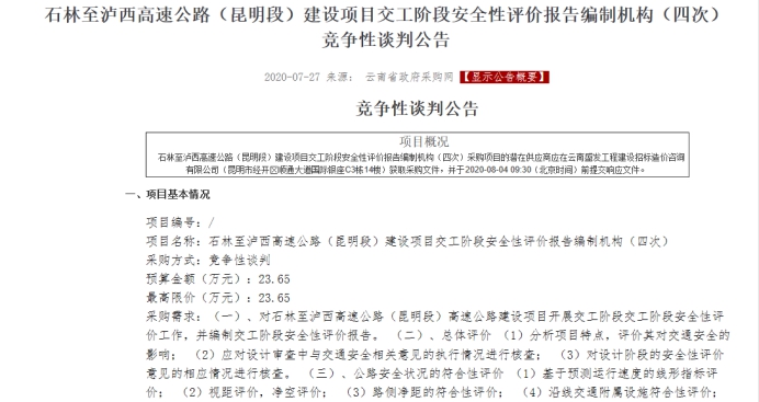 石林至泸西高速公路(昆明段)建设项目交工阶段安全性评价报告编制机构招标(四次)竞争性谈判公告