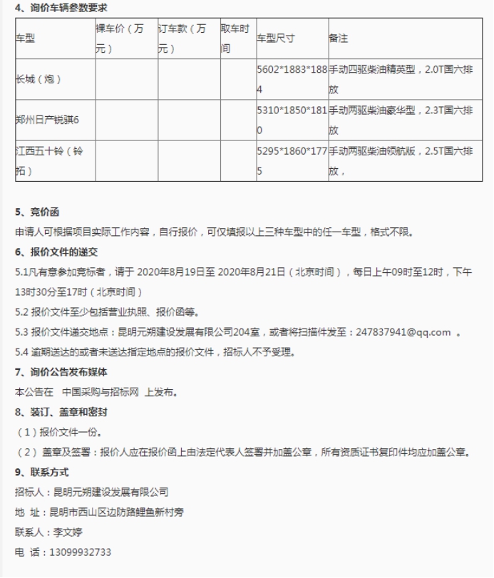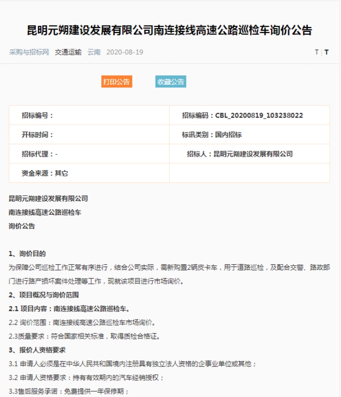 昆明元朔建设发展有限公司南连接线高速公路巡检车询价公告