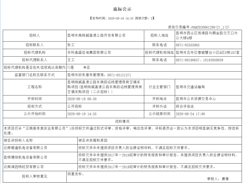 昆明绕城高速公路东南段沿线管理用房空调采购项目(二次)流标公示