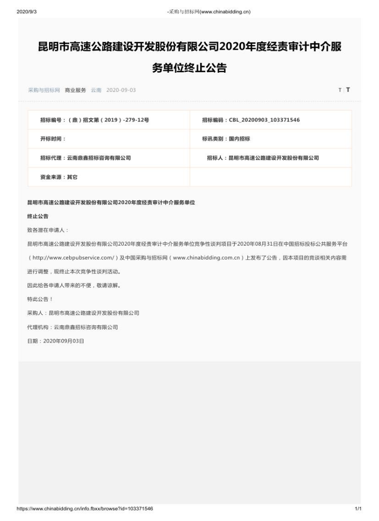 昆明市高速公路建设开发股份有限公司2020年度经责审计中介服务单位终止公告