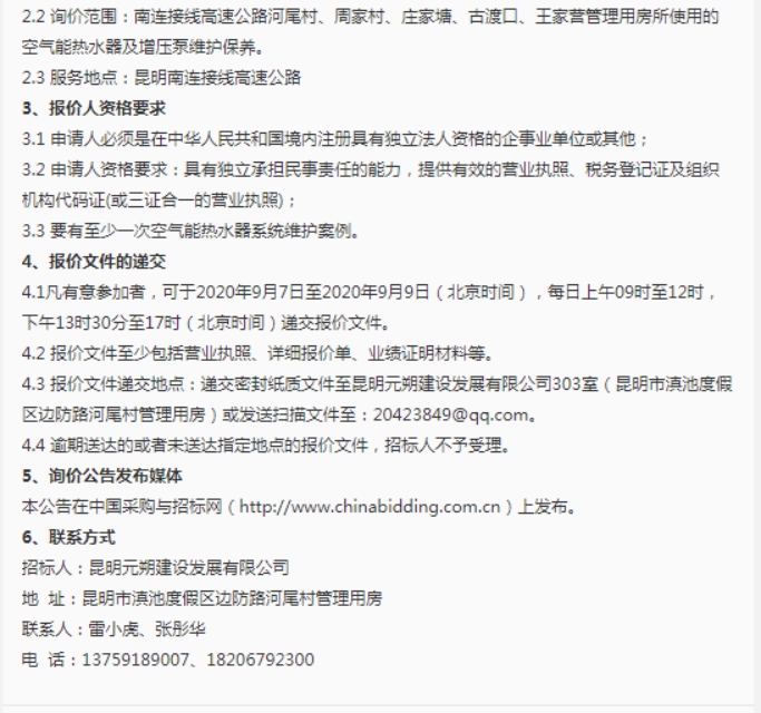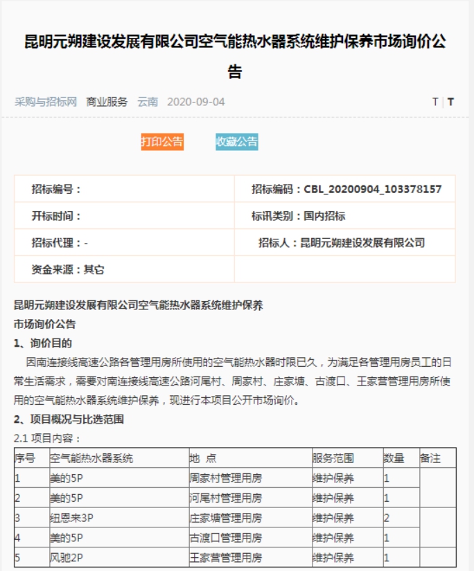昆明元朔建设发展有限公司空气能热水器系统维护保养市场询价公告