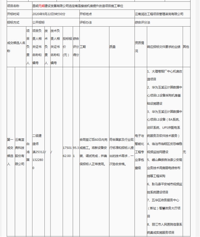 昆明元朔建设发展有限公司选定南连接线机房提升改造项目施工单位竞争性谈判评标结果公示