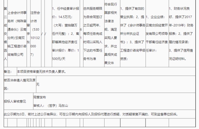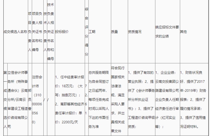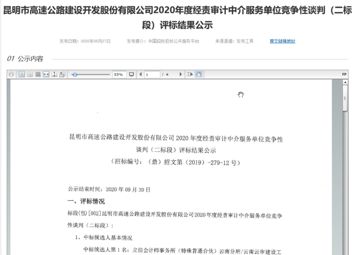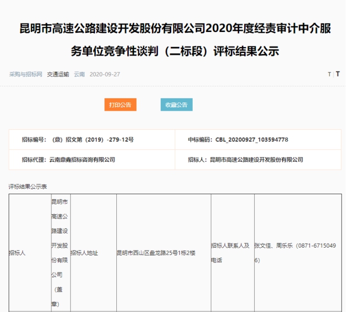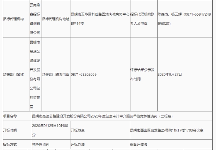 昆明市高速公路建设开发股份有限公司2020年度经责审计中介服务单位竞争性谈判(二标段)评标结果公示