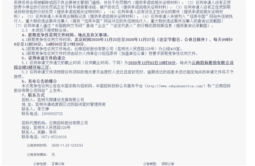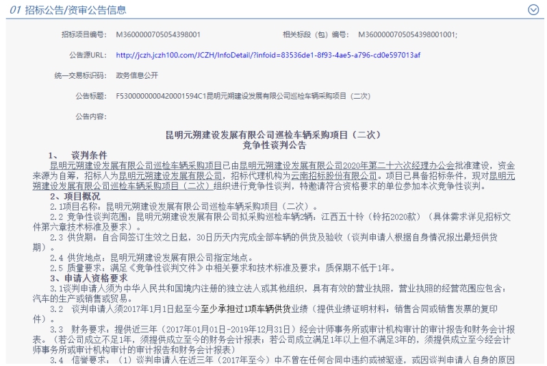 昆明元朔建设发展有限公司巡检车辆采购项目(二次)竞争性谈判公告