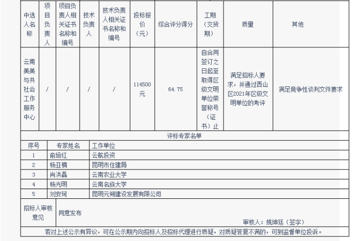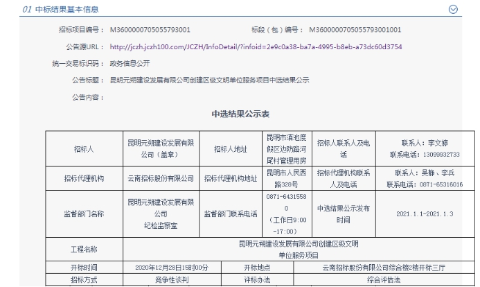 昆明元朔建设发展有限公司创建区级文明单位服务项目中标结果公示
