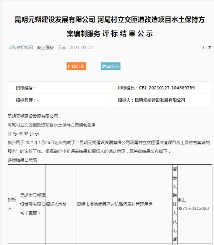 昆明元朔建设发展有限公司河尾村立交匝道改造项目水土保持方案编制服务评标结果公示