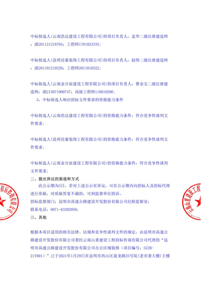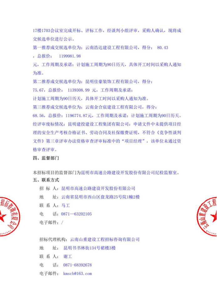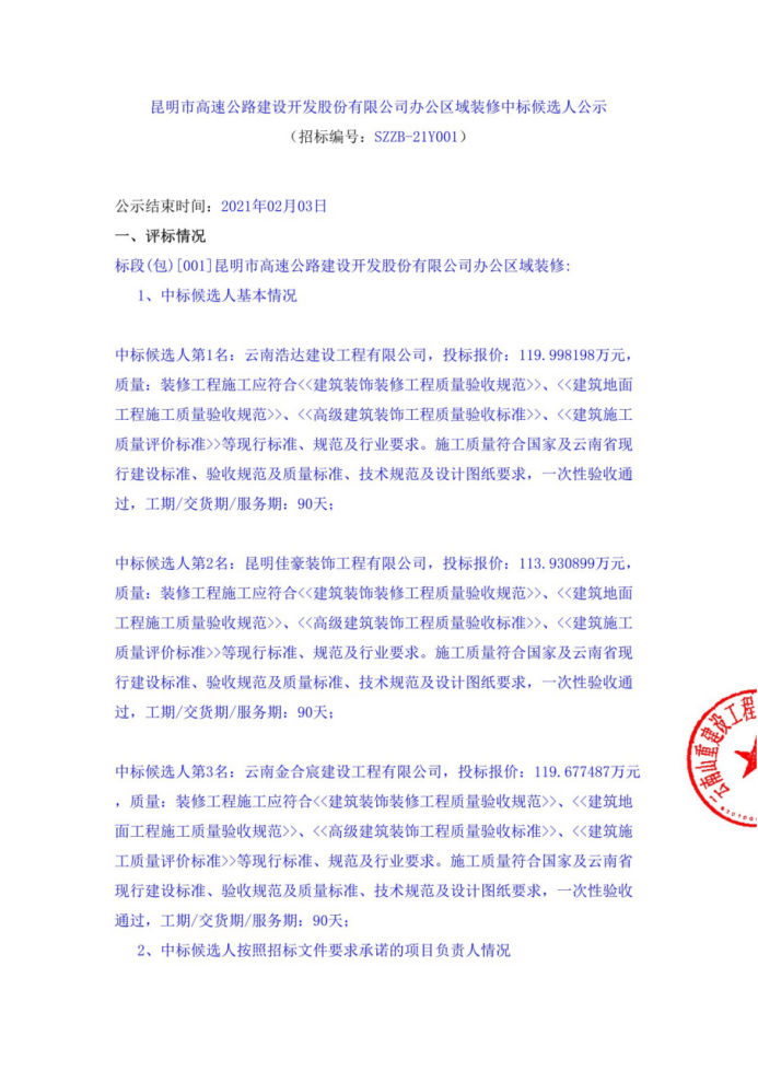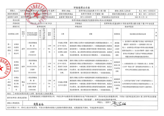 昆明市高速公路建设开发股份有限公司办公区域装修评标结果公示