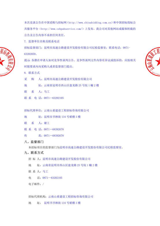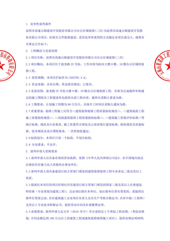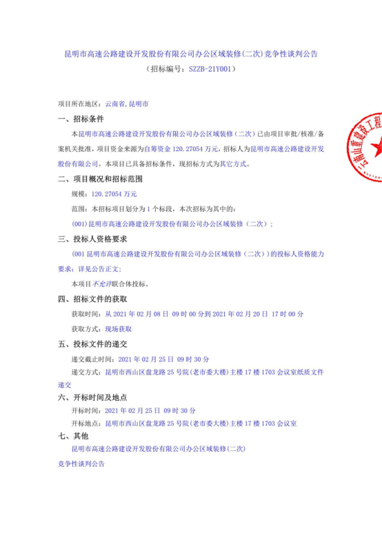 昆明市高速公路建设开发股份有限公司办公区域装修(二次) 竞争性谈判公告