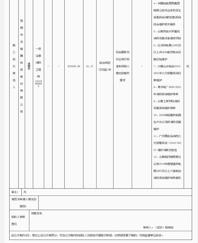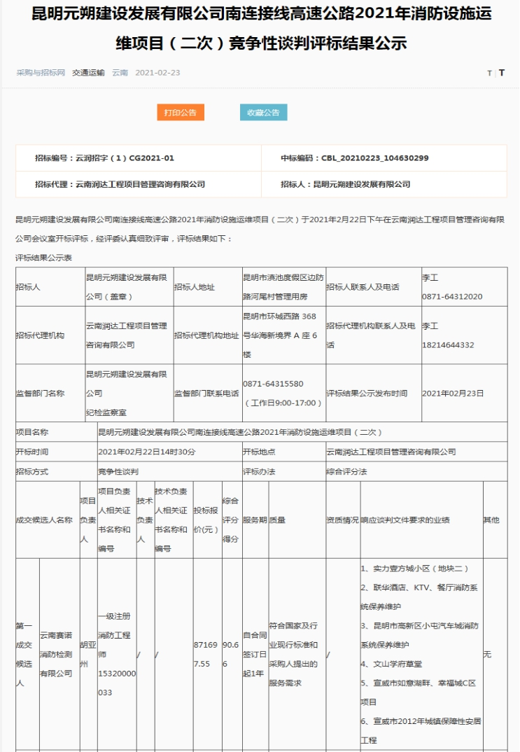 昆明元朔建设发展有限公司南连接线高速公路2021年消防设施运维项目(二次)评标结果公示