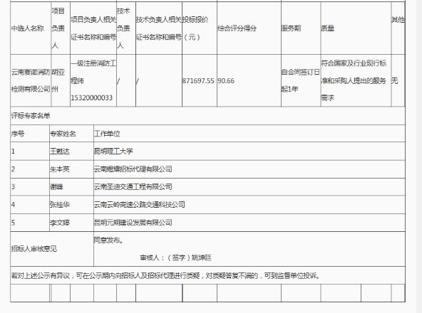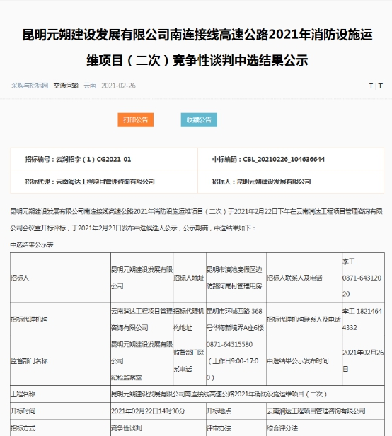昆明元朔建设发展有限公司南连接线高速公路2021年消防设施运维项目(二次)竞争性谈判中选结果公示