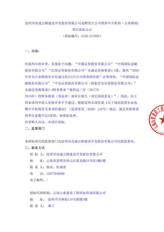 昆明市高速公路建设开发股份有限公司选聘发行公司债券中介机构(主承销商)项目流标公示