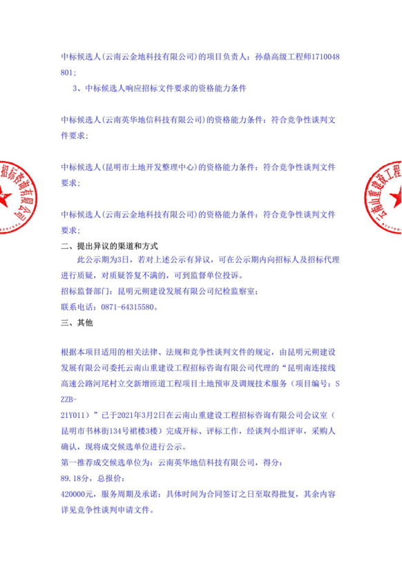 昆明南连接线高速公路河尾村立交新增匝道工程项目土地预审及调规技术服务评标结果公示