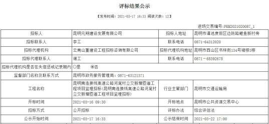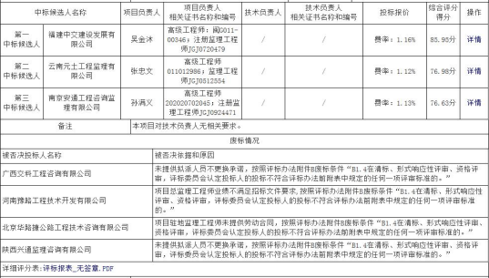 昆明南连接线高速公路河尾村立交新增匝道工程项目监理招标评标结果公示