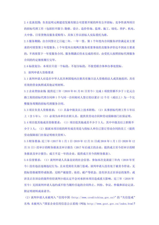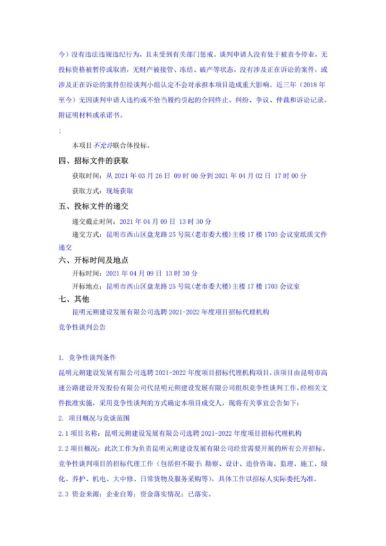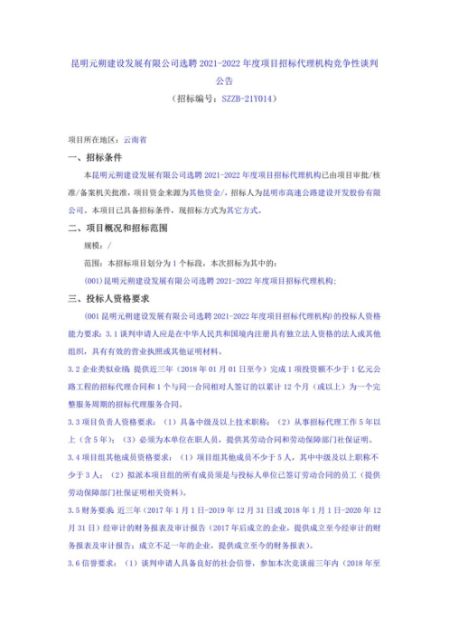 昆明元朔建设发展有限公司选聘2021-2022年度项目招标代理机构竞争性谈判公告