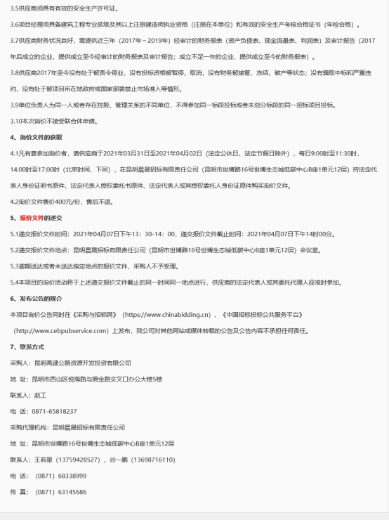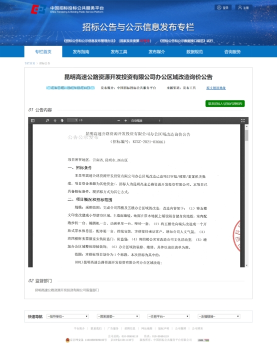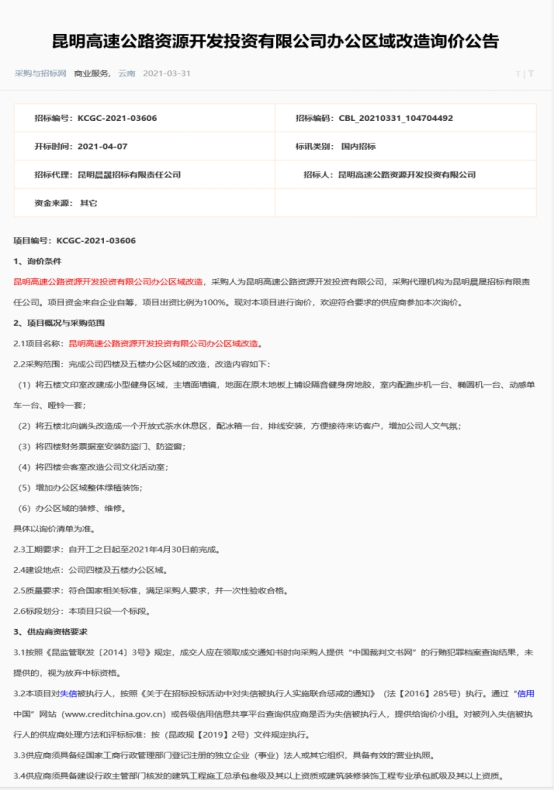 昆明高速公路资源开发投资有限公司办公区域询价公告
