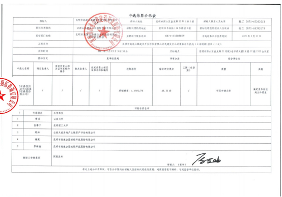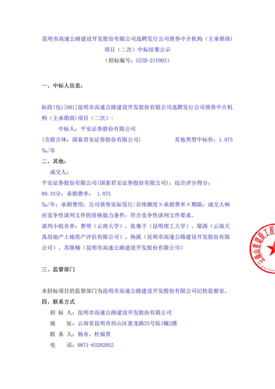昆明市高速公路建设开发股份有限公司选聘发行公司债券中介机构(主承销商)项目(二次)中标结果公示