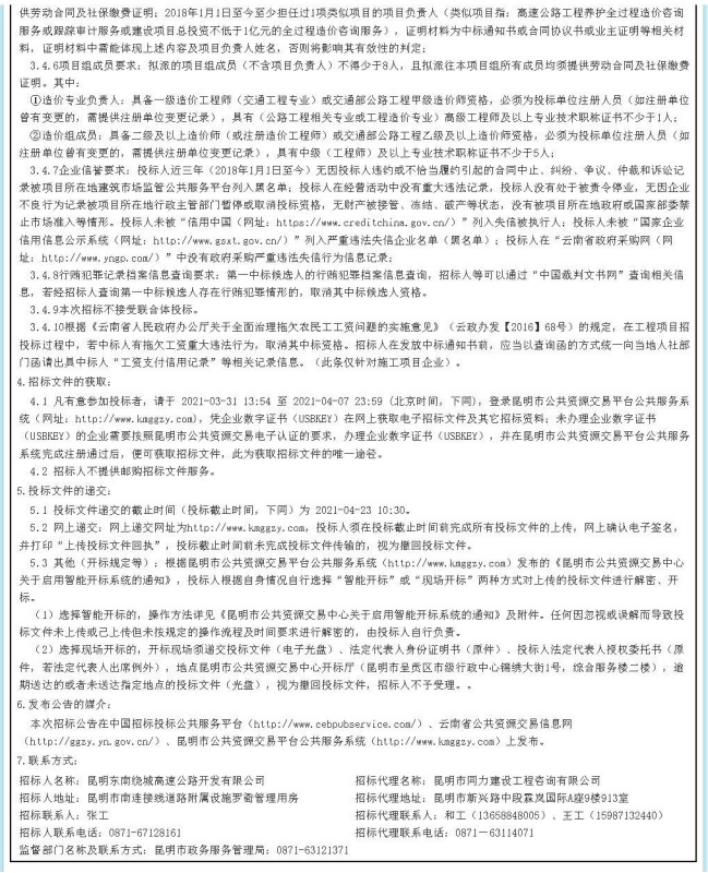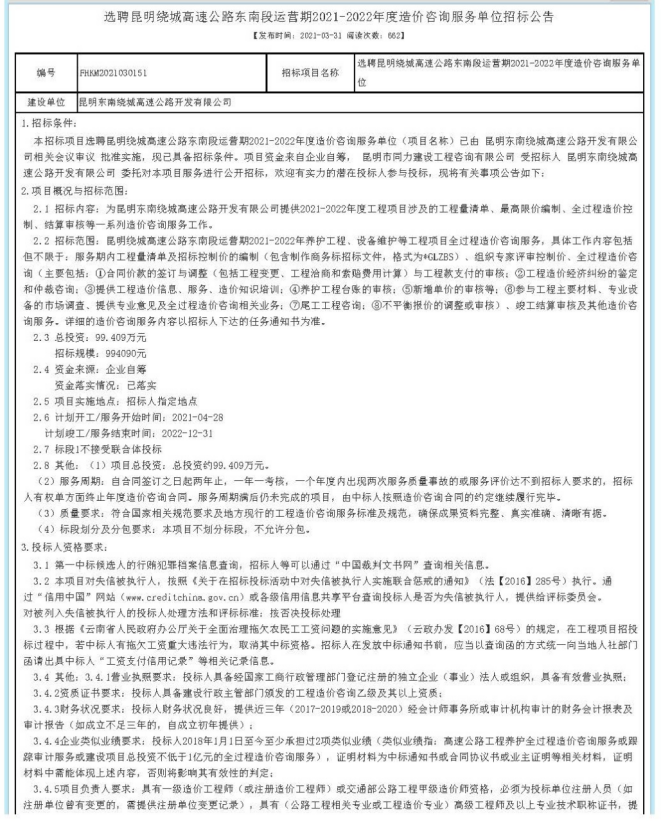 选聘昆明绕城高速公路东南段运营期2021-2022年度造价咨询服务单位招标公告