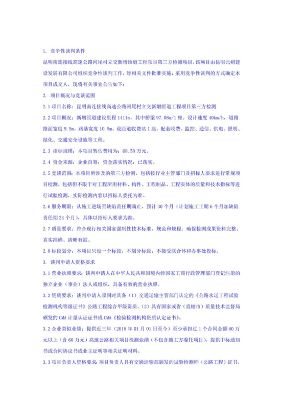 昆明南连接线高速公路河尾村立交新增匝道工程项目第三方检测竞争性谈判公告
