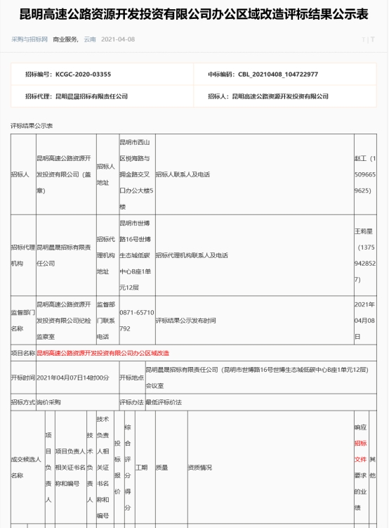 昆明高速公路资源开发投资有限公司办公区域询价活动评审结果公示