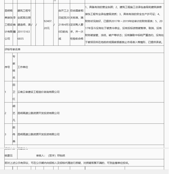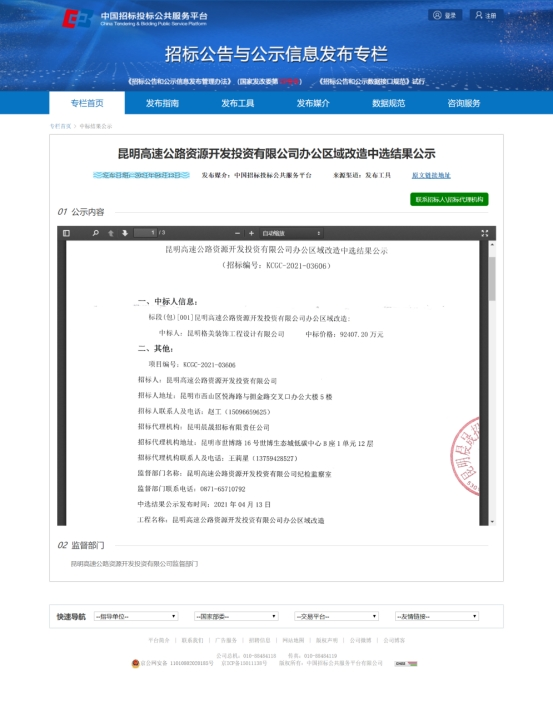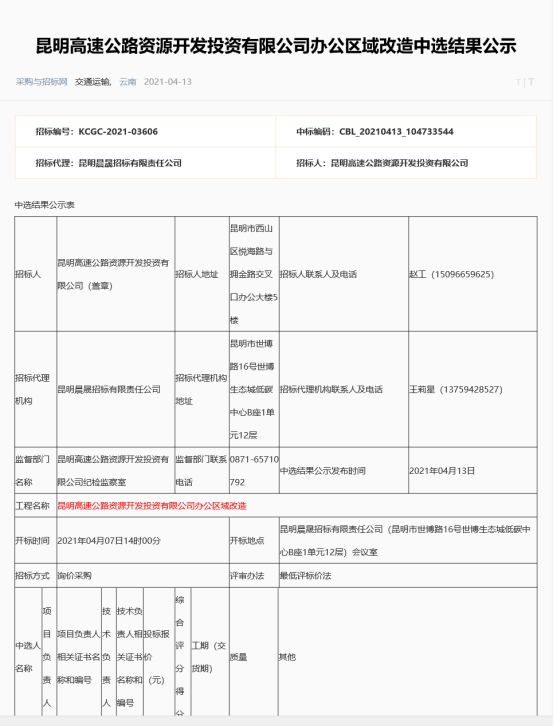 昆明高速公路资源开发投资有限公司办公区域询价活动中选结果公示