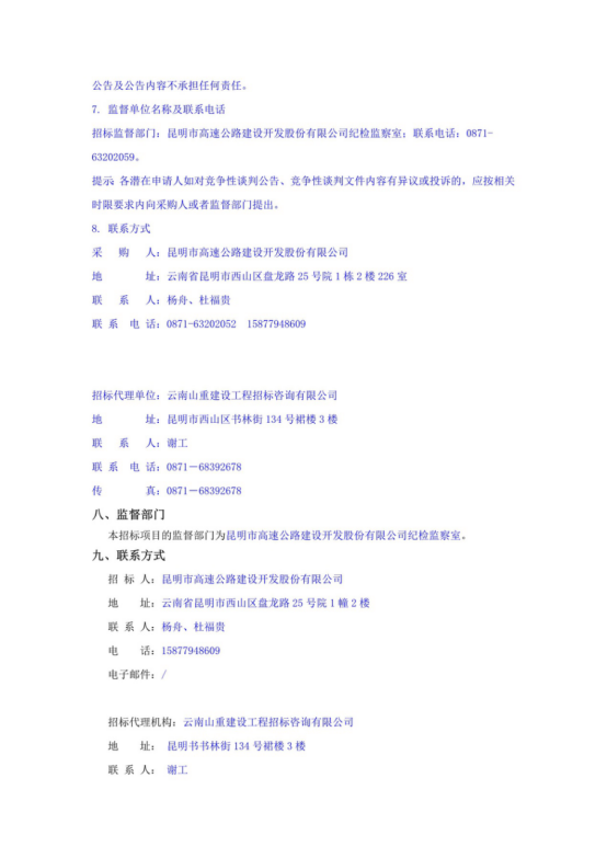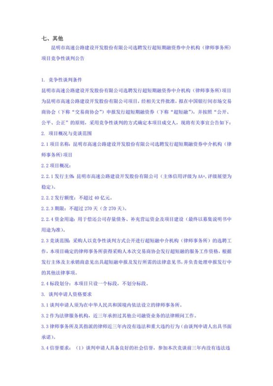 昆明市高速公路建设开发股份有限公司选聘发行超短期融资券中介机构(律师事务所)项目竞争性谈判公告