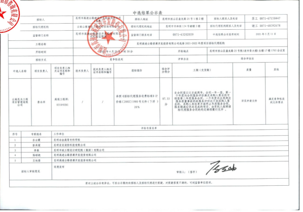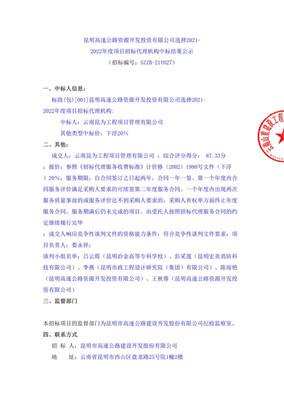 昆明高速公路资源开发投资有限公司选择2021-2022年度项目招标代理机构中标结果公示