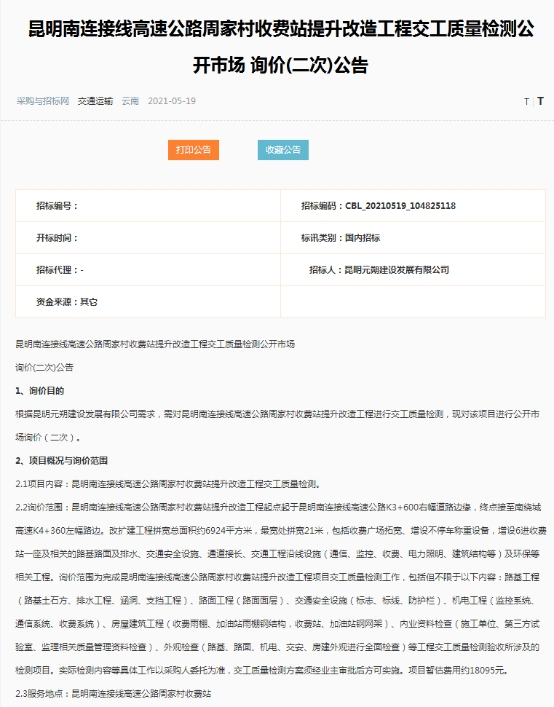 昆明南连接线高速公路周家村收费站提升改造工程交工质量检测公开市场询价(二次)公告