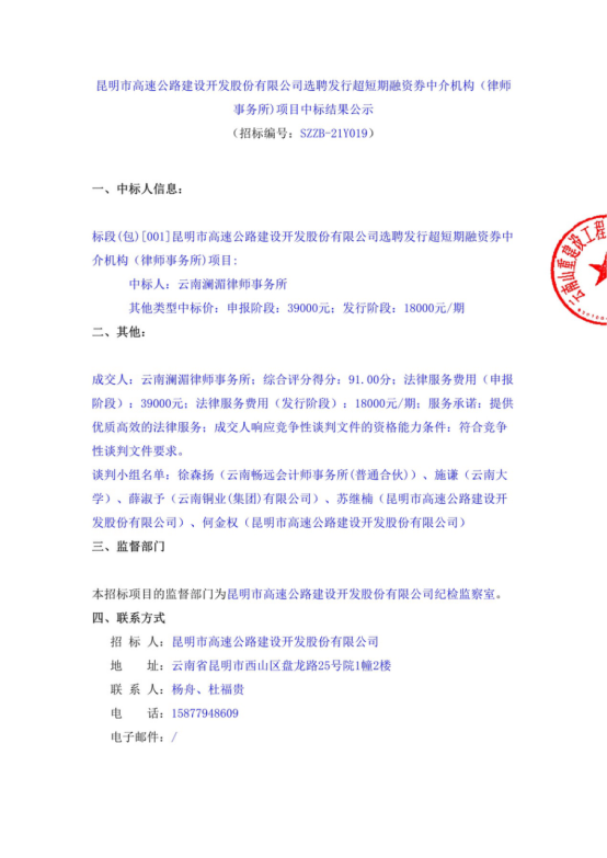昆明市高速公路建设开发股份有限公司选聘发行超短期融资券中介机构(律师事务所)项目中标结果公示
