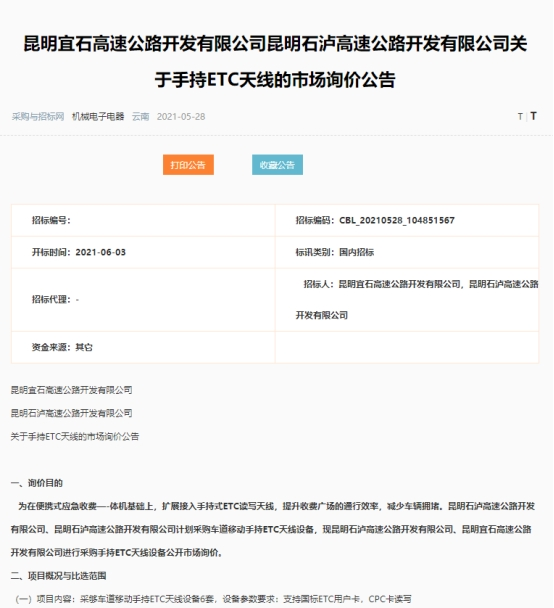 昆明宜石高速公路开发有限公司、昆明石泸高速公路开发有限公司关于手持ETC天线的市场询价公告