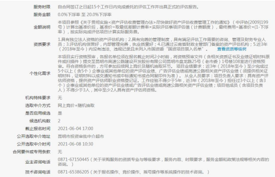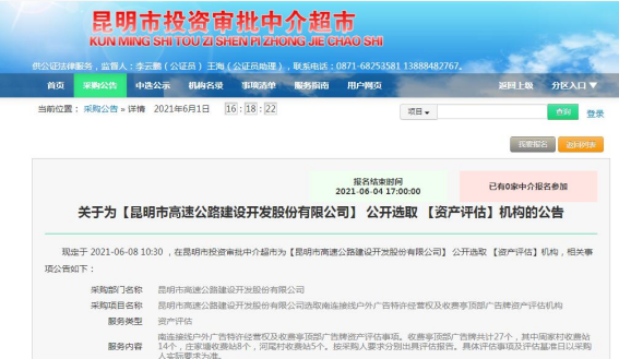 关于为【昆明市高速公路建设开发股份有限公司】 公开选取 【资产评估】机构的公告