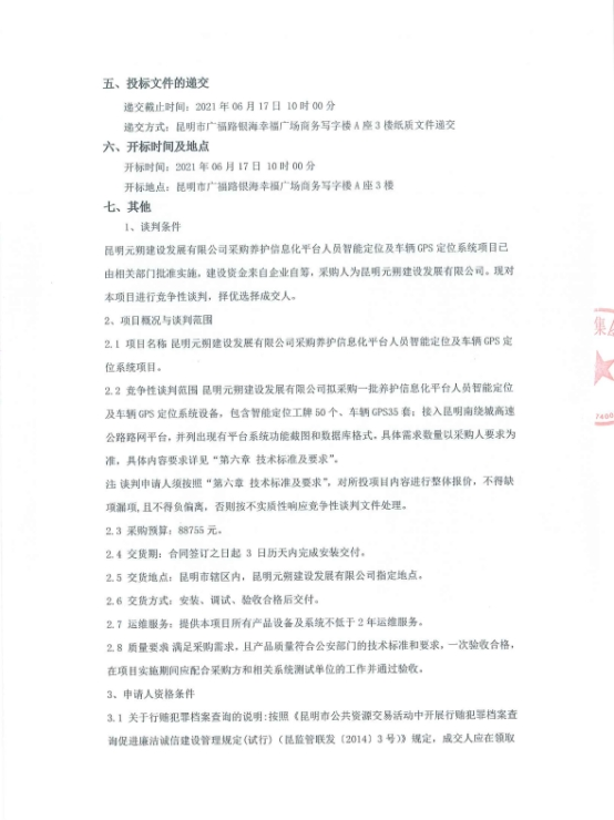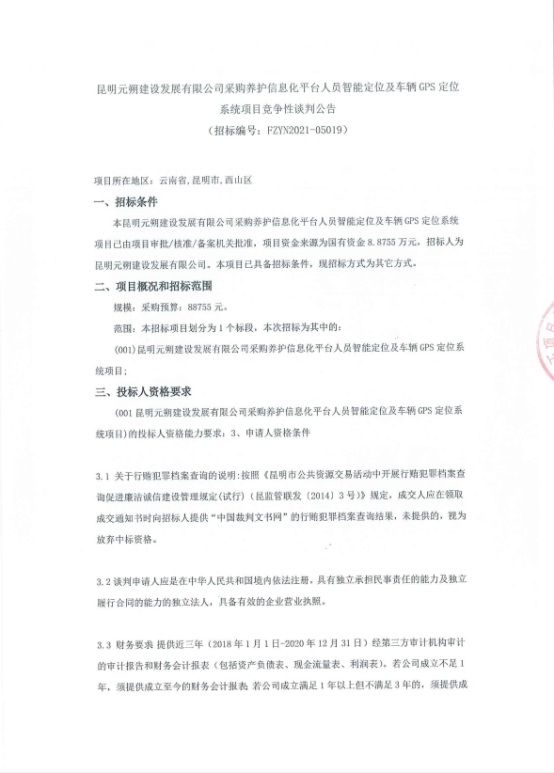 昆明元朔建设发展有限公司采购养护信息化平台人员智能定位及车辆GPS定位系统项目竞争性谈判公告
