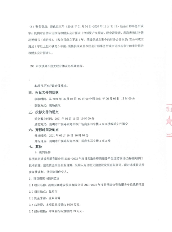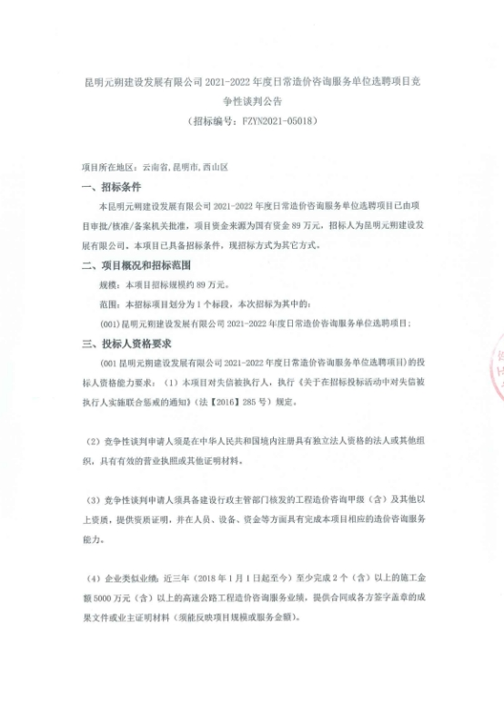 昆明元朔建设发展有限公司2021-2022年度日常造价咨询服务单位选聘项目竞争性谈判公告