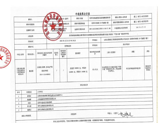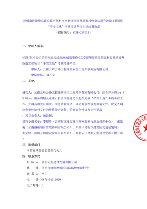 昆明南连接线高速公路河尾村立交新增匝道及周家村收费站提升改造工程项目“平安工地”考核考评单位中标结果公示