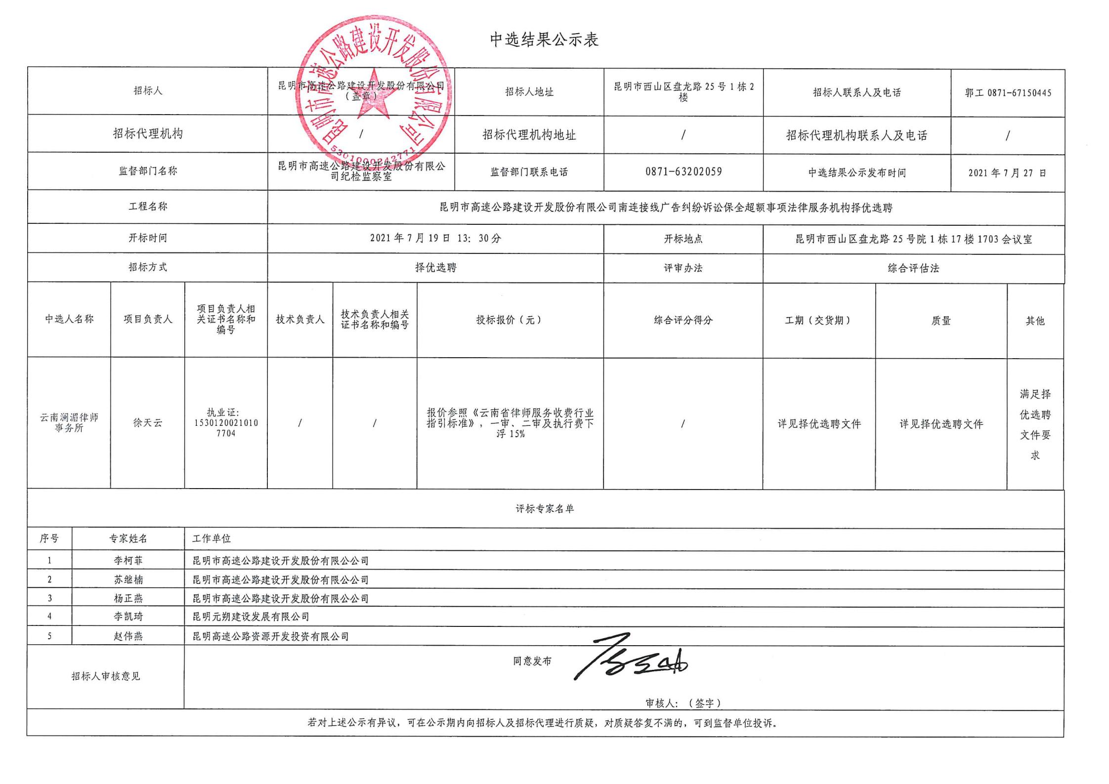 昆明市高速公路建设开发股份有限公司选聘南连接线广告纠纷诉讼保全超额事项法律服务机构中选结果公示