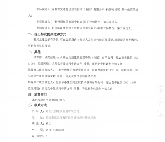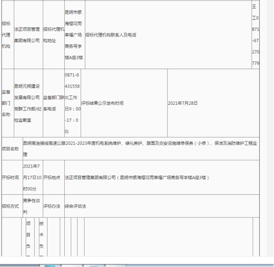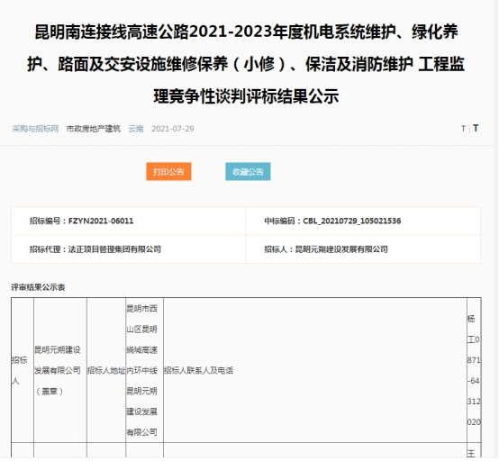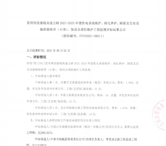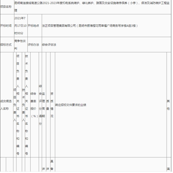 昆明南连接线高速公路2021-2023年度机电系统维护、绿化养护、路面及交安设施维修保养(小修)、保洁及消防维护工程监理评标结果公示