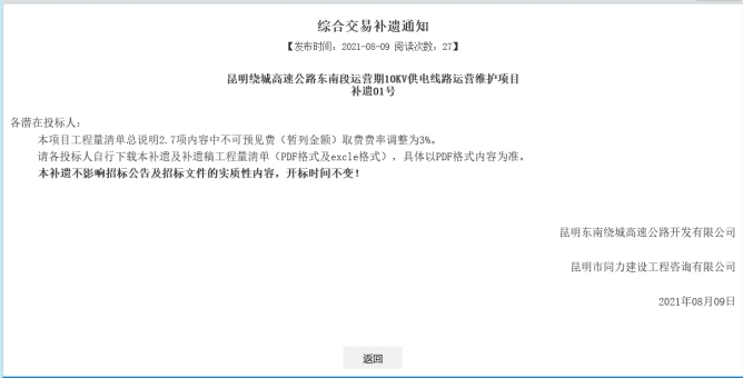 昆明绕城高速公路东南段运营期10KV供电线路运营维护项目补遗01号