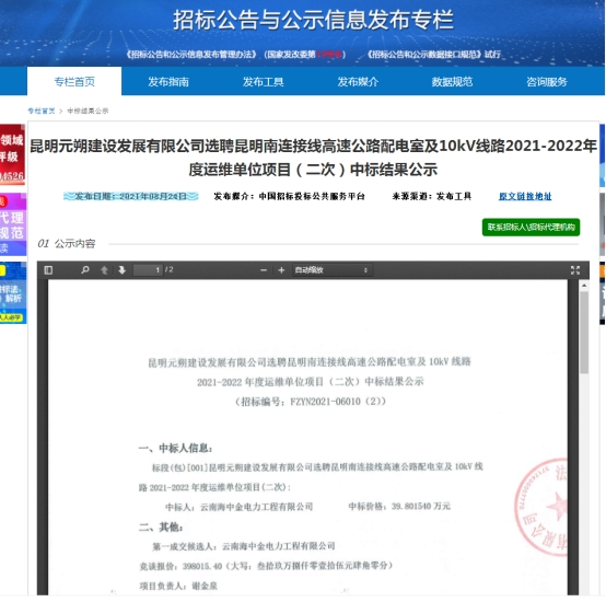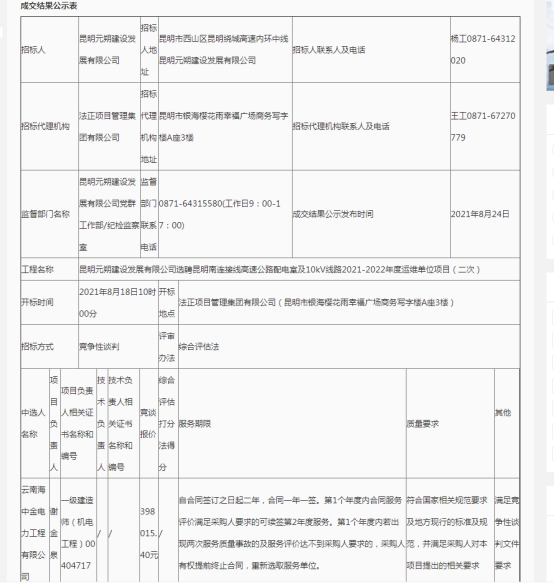 昆明元朔建设发展有限公司选聘昆明南连接线高速公路配电室及10kV线路2021-2022年度运维单位项目(二次)中标结果公示