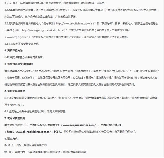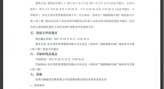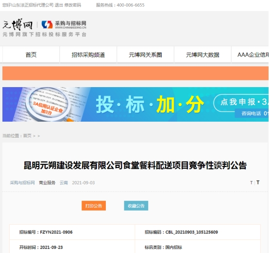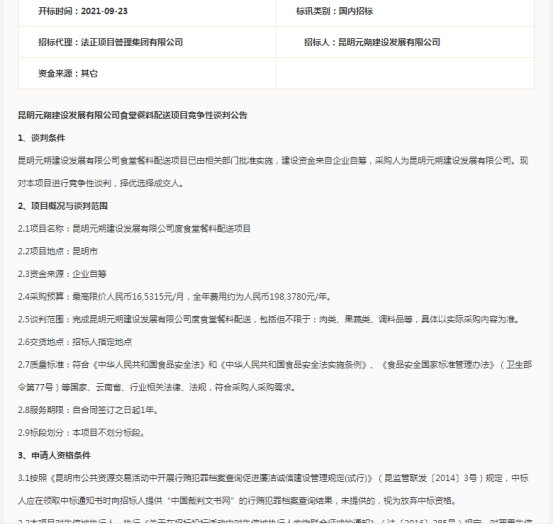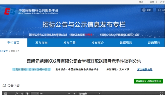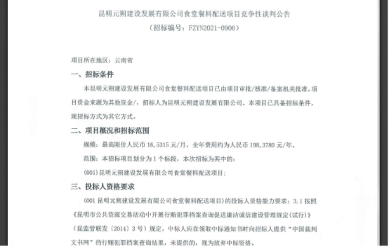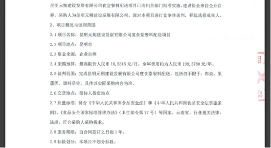 昆明元朔建设发展有限公司食堂餐料配送项目竞争性谈判公告