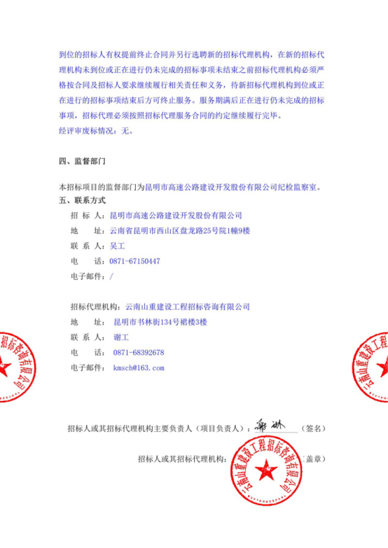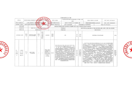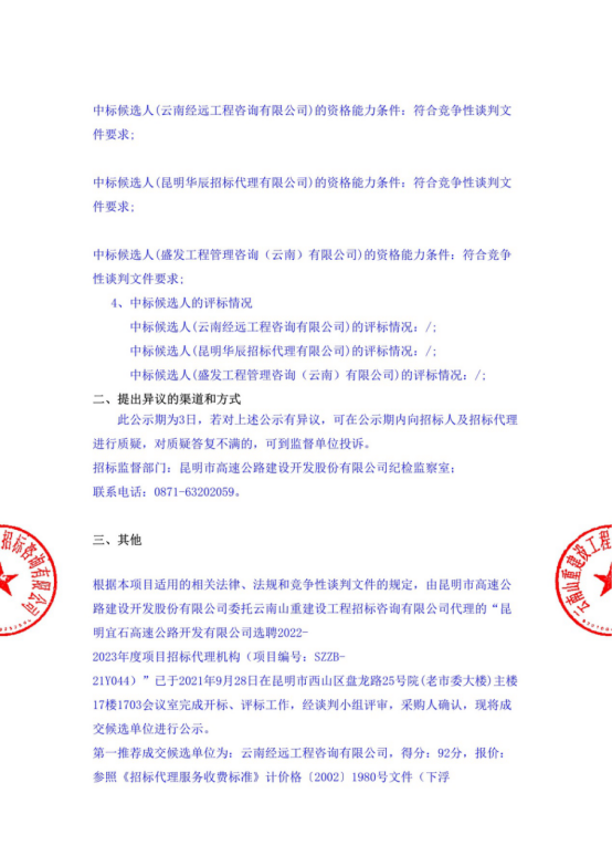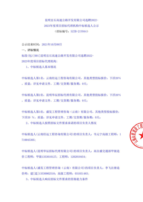 昆明宜石高速公路开发有限公司选聘2022-2023年度项目招标代理机构中标候选人公示