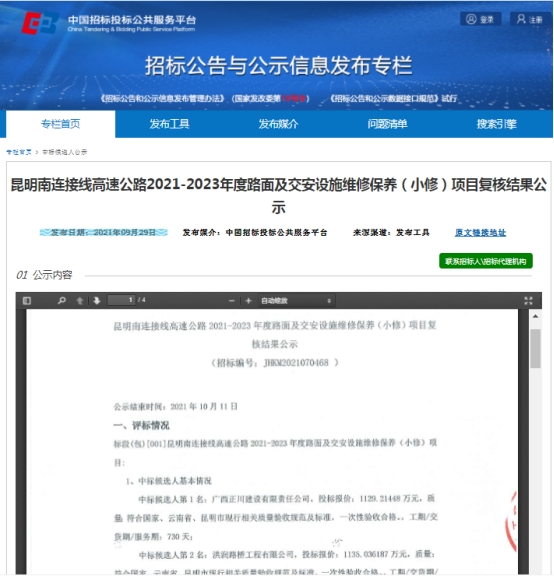 昆明南连接线高速公路2021-2023年度路面及交安设施维修保养(小修)项目复核结果公示