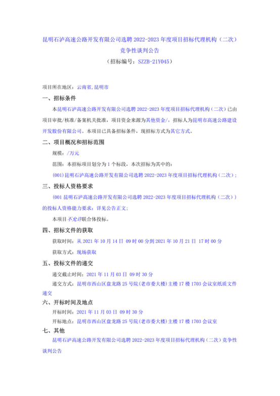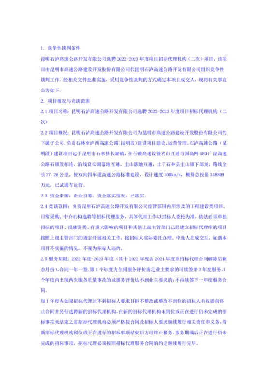 昆明石泸高速公路开发有限公司选聘2022-2023年度项目招标代理机构(二次)