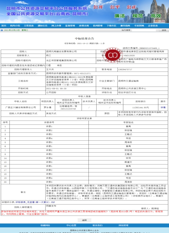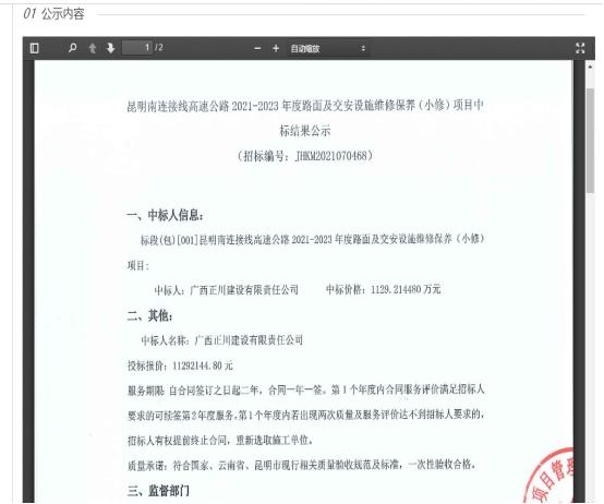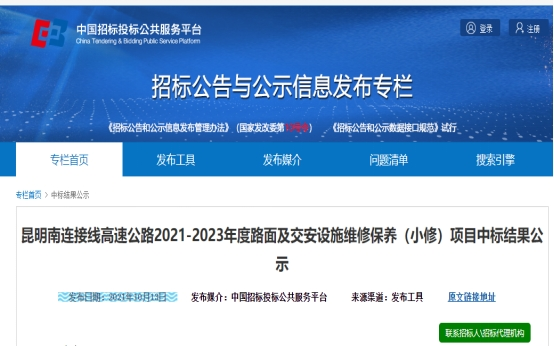 昆明南连接线高速公路2021-2023年度路面及交安设施维修保养(小修)项目中标结果公示