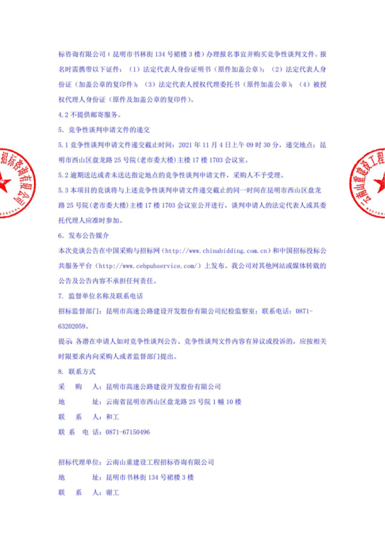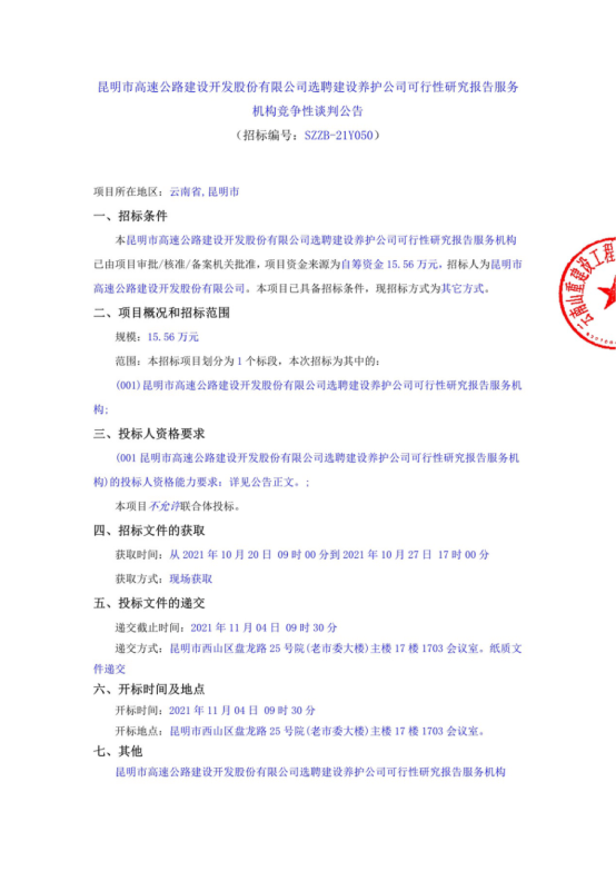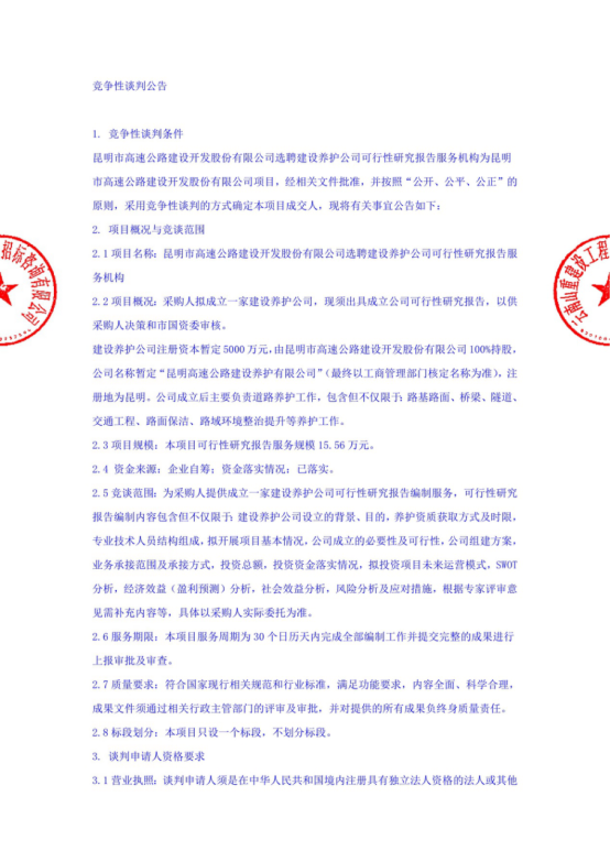 昆明市高速公路建设开发股份有限公司选聘建设养护公司可行性研究报告服务机构竞争性谈判公告