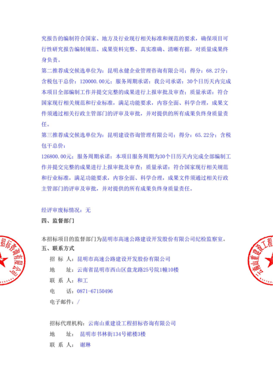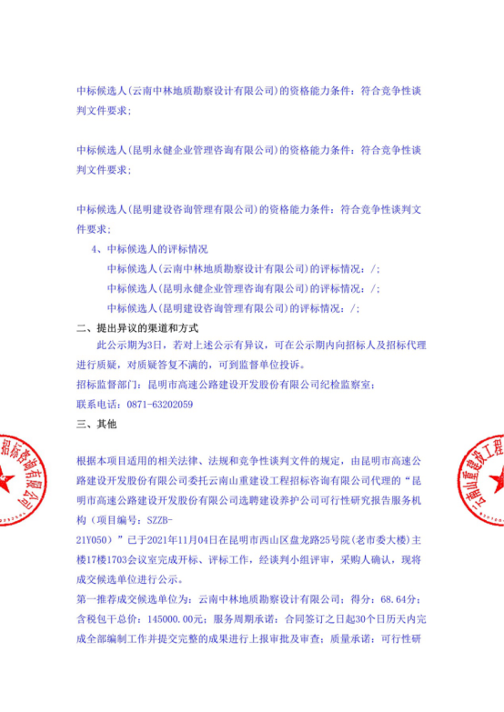 昆明市高速公路建设开发股份有限公司选聘建设养护公司可行性研究报告服务机构中标候选人公示