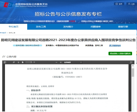 昆明元朔建设发展有限公司选聘2021-2023年度办公家具供应商入围项目竞争性谈判公告
