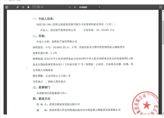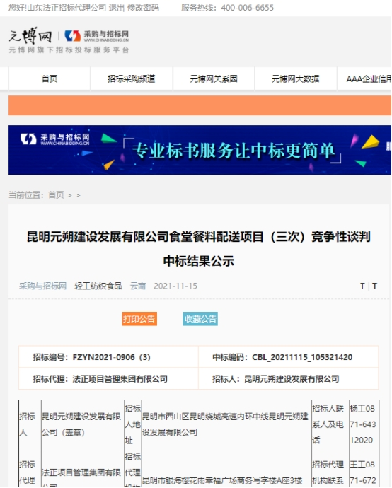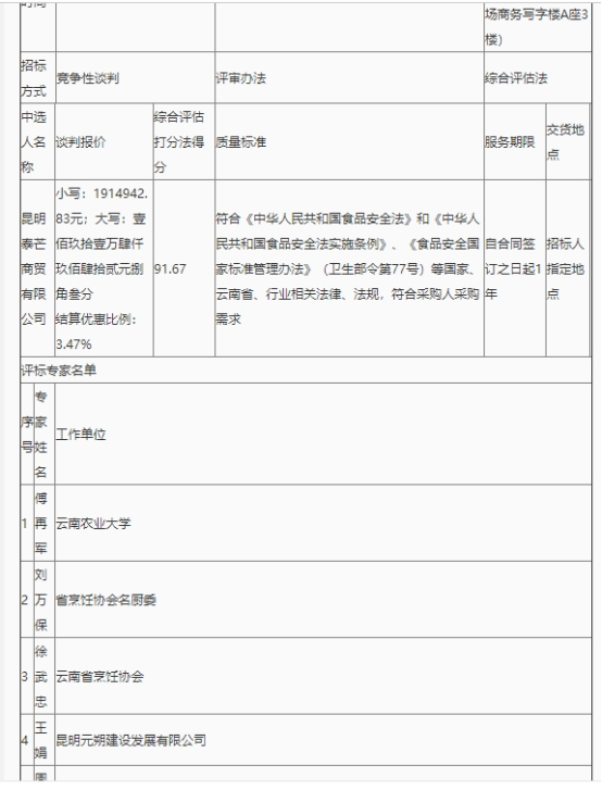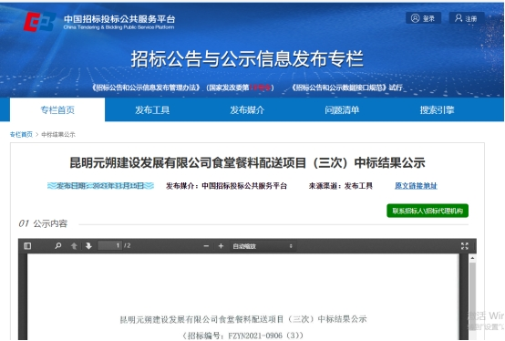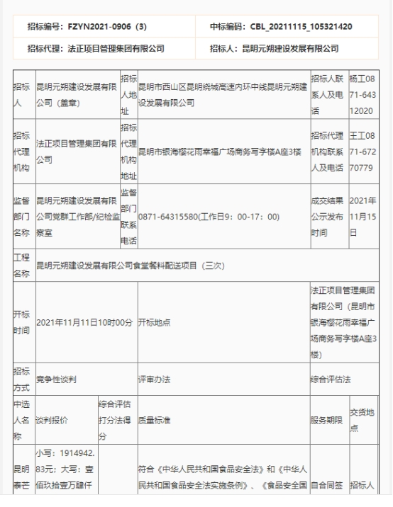 昆明元朔建设发展有限公司食堂蔬菜配送服务竞争性谈判中标公示(三次)