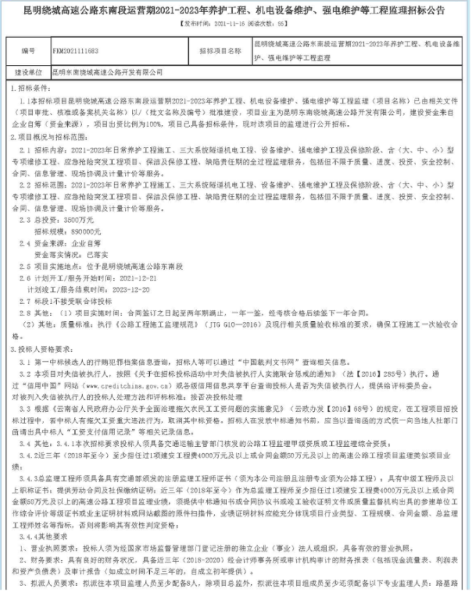 昆明绕城高速公路东南段运营期2021-2023年养护工程、机电设备维护、强电维护等工程监理招标公告